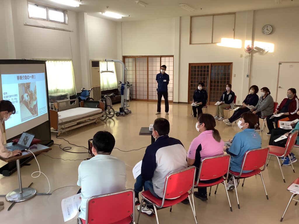 12/10に兵庫医科大学ささやま医療センターリハビリテーション室、理学療法士の村上茂史先生と作業療法士の藤本安里先生を当施設にお招きし、移乗動作の介助不法についての出張研修を実施していただきました。