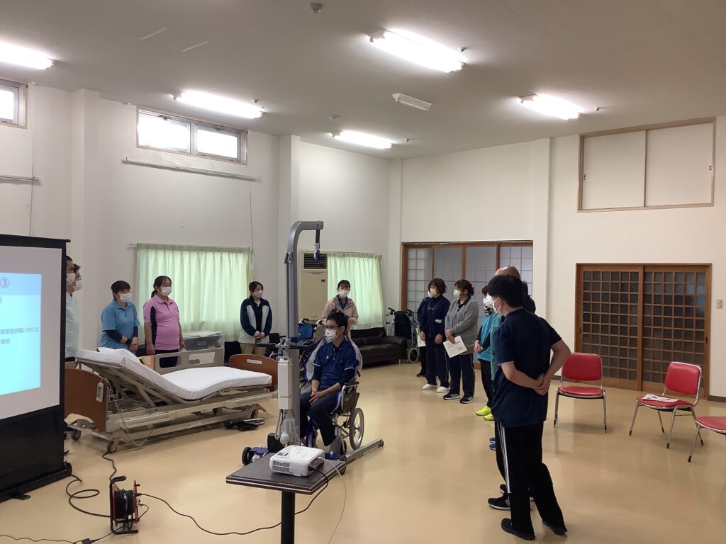 研修では、移乗リフトを使用した移乗介助についても詳しく教えていただきました。