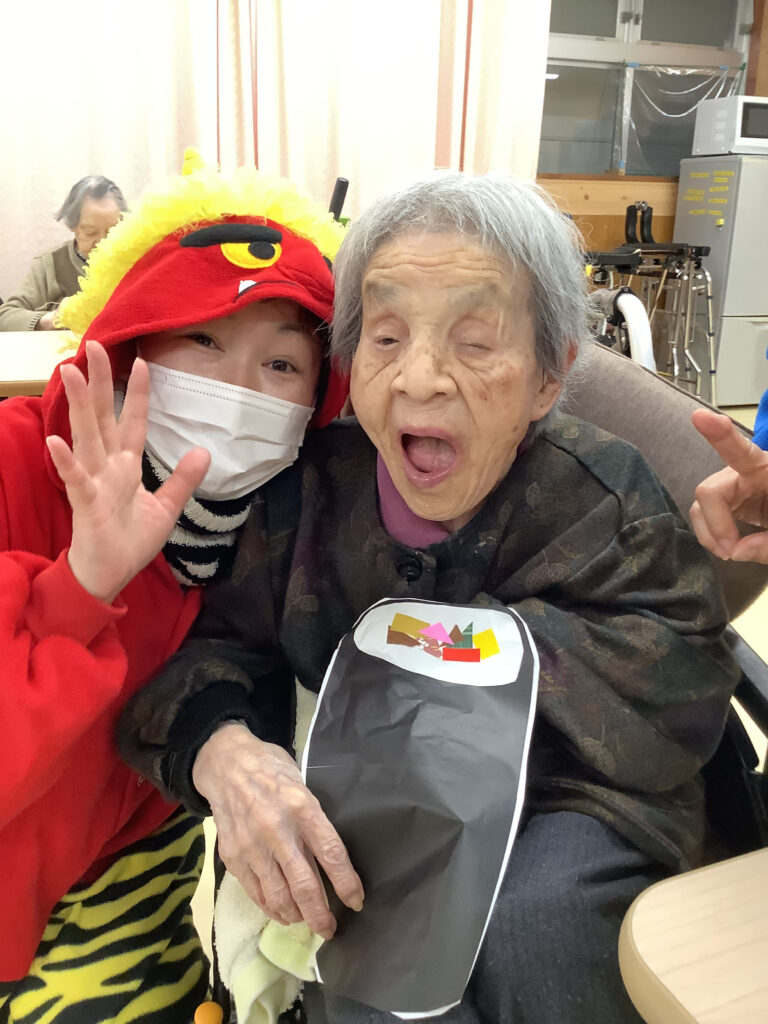 また、鬼に扮した職員を見た利用者の皆さまの表情が明るくなる様子もあり、とてもいい雰囲気の中、行事を行なう事が出来ました。