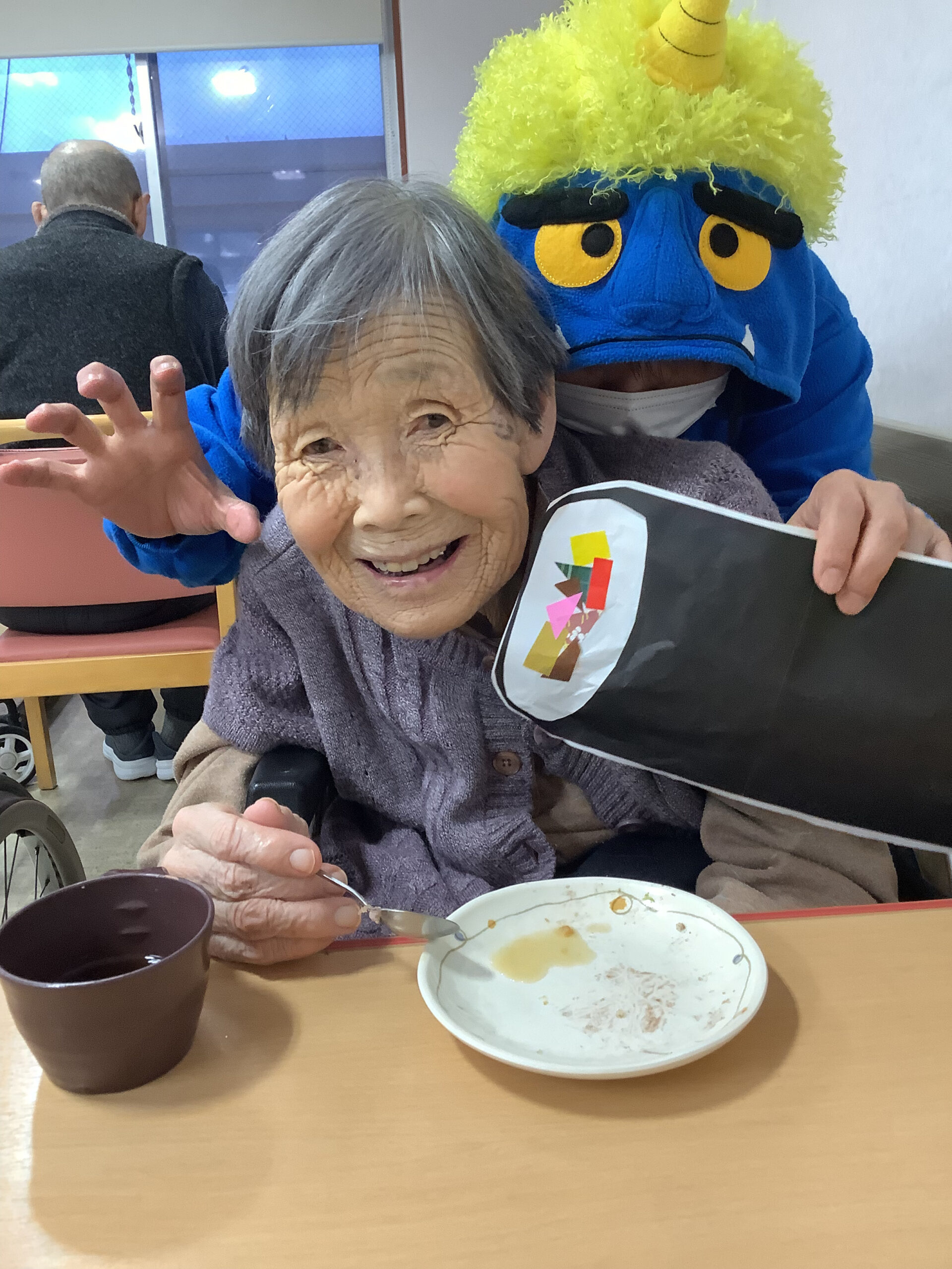 令和8年2月16日、今月の行事として鬼カフェ、という事でケーキを食べながら鬼に扮した職員と記念撮影を行ないました。